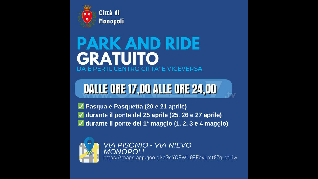 Il Sindaco di Monopoli, Angelo Annese, comunica che da domenica 20 aprile 2025 sarà attivo il servizio gratuito di Park and Ride per facilitare gli spostamenti da e verso il centro cittadino.