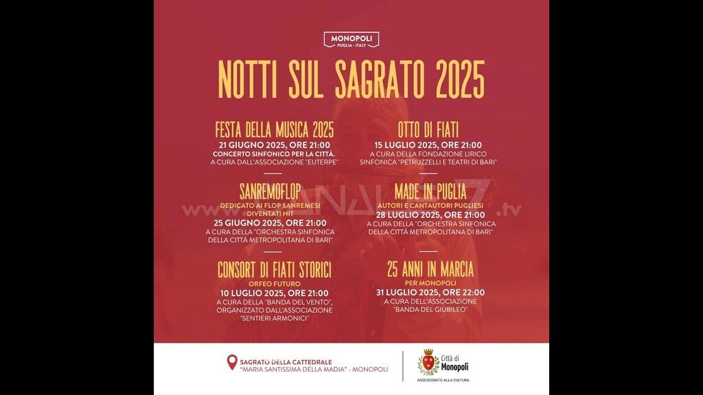 Anche quest’anno Monopoli si prepara a vivere un’estate all’insegna della musica e della bellezza con “Notti sul Sagrato 2025”, la rassegna che trasforma il cuore del centro storico in uno spazio condiviso di arte e cultura. Una serie di concerti dell’Assessorato alla Cultura, tutti a ingresso libero, pensati per restituire alla città momenti di ascolto e partecipazione nel suggestivo scenario del sagrato della Basilica Cattedrale. La rassegna si svolgerà da sabato 21 giugno a giovedì 31 luglio. Un servizio nel telegiornale