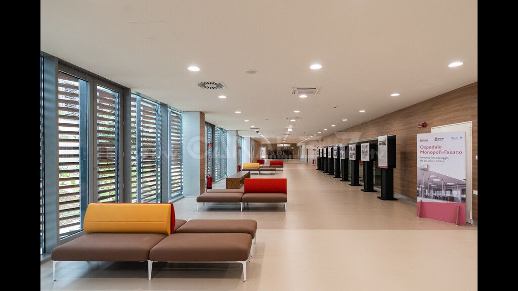 Dal paesaggio rurale alle opere d’ingegno, architettoniche ed artistiche. C’è tutto questo nel Nuovo Ospedale di Monopoli-Fasano, dove anche la bellezza è “strumento” di cura. Intorno all’edificio sono stati eretti 2 km di “muretti a secco”, una lavorazione unica realizzata con la pietra naturale - riconosciuta nel 2018 dall’Unesco come Patrimonio immateriale dell’Umanità. Parte integrante dell’eco-design del presidio sono altresì i circa 200 ulivi monumentali temporaneamente spostati in altra area durante i lavori e, al termine, reimpiantati nel luogo di origine: una dimostrazione di come si possa unire la funzionalità architettonica alle più moderne esigenze sanitarie, senza intaccare la bellezza dei luoghi.