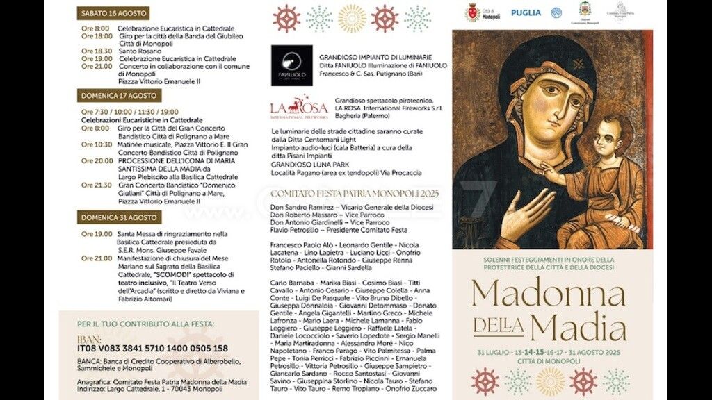 Alla mezzanotte di domani giovedì 31 luglio 2025 a Monopoli si avviano le iniziative per il mese Mariano, in onore della protettrice Maria Santissima della Madia. Il comitato Festa Patria ha già da tempo avviato i motori organizzativi.Iintervista a Flavio Petrosillo, presidente del locale Comitato Festa Patria. Un servizio nel telegiornale
