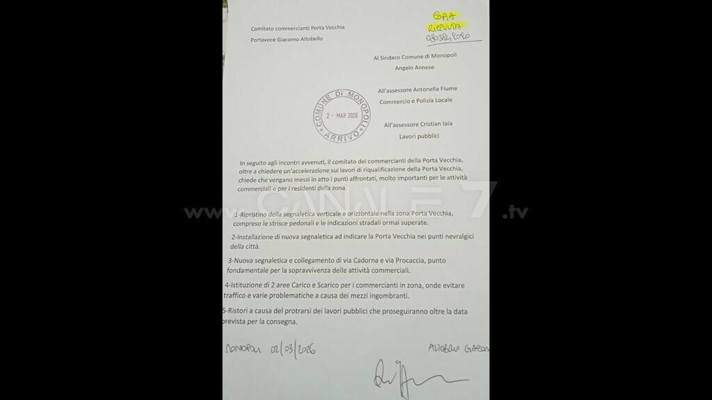 Sul punto ai lavori di riqualificazione a Porta Vecchia il comitato operatori ha prodotto un documento inviato al sindaco di Monopoli Angelo Annese, e agli assessori Antonella Fiume e Cristian Iaia, in cui si avanzano delle richieste. Il comitato operatori interviene ache sulla recente querelle sulla proroga di 180 giorni ai lavori in corso, poi smentita dall’assessore ai lavori pubblici Iaia. Un servizio el telegiornale