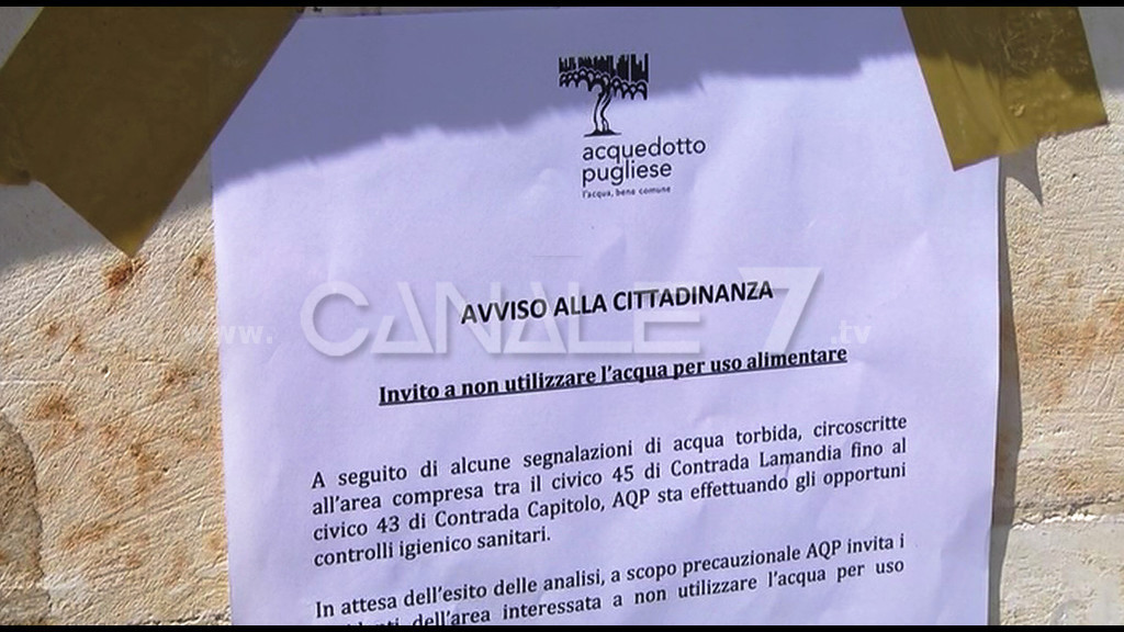 Il timore era quello di una contaminazione delle acque fra contrada Capitolo e contrada Lamandia. Acquedotto Pugliese aveva ineterdetto l'uso dell'acqua potabile in attesa del responso del campionamento delle acque effettuato dalla ASL Bari. Il risultato delle analisi sarebbe negativo. "Si evidenzia il pieno rispetto dei limiti di legge previsti per le acque destinate al consumo umano". Così si legge nella nota diffusa da Aqp.
