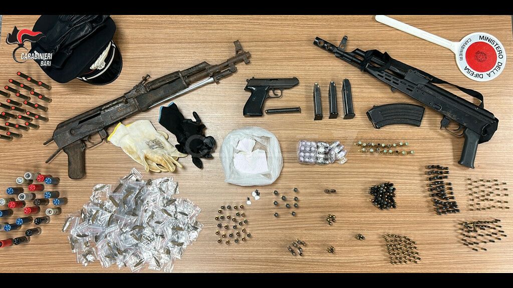 L’operazione è stata indirizzata al controllo di alcune cantinole di un condominio di edilizia popolare di via della Felicità ove, nell’ambito di attività info-investigativa, era stato segnalato nei giorni scorsi un sospetto afflusso di persone. Grazie all’ausilio delle unità cinofile dell’Arma, l’attenzione dei militari si è soffermata in un box, al cui interno è stata rinvenuta una sacca contenente 230 grammi circa di “cocaina” in polvere, suddivisa in più ovuli, 420 grammi circa di “hashish”, raccolti in ovuli e singole bustine per la vendita, bilancino di precisione e materiale per il confezionamento. Nel corso delle operazioni, i militari hanno inoltre notato all’interno di uno scatolone di grandi dimensioni la presenza di due Kalasnikov AK-47, perfettamente funzionanti, di cui uno con caricatore completo di munizioni e pronto ad un rapido utilizzo. Oltre alle 2 “armi da guerra”, è stata rinvenuta una pistola “clandestina” con matricola abrasa, completa di 6 munizioni all’interno del caricatore, e la presenza complessiva di 350 munizioni di vario calibro, relative a pistole e armi lunghe.
