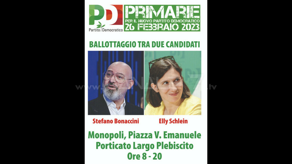 Domenica 26 febbraio, dalle ore 8 alle 20, si terranno le primarie del Partito Democratico, che vedranno sfidarsi il Presidente della Regione Emilia Romagna Stefano Bonaccini e la deputata Elly Schlein per il ruolo di segretario nazionale. Le urne saranno aperte dalle 8.00 del mattino fino alle 20.00 e potranno votare anche i non iscritti al partito che si sentono elettori del Pd e che dovranno sottoscrivere in tal senso una dichiarazione versando un contributo di 2 euro. Sarà poi necessario presentarsi con un documento d’identità. A Monopoli sarà possibile votare in Piazza Vittorio Emanuele, sotto il porticato nei pressi della ex Banca Carige.