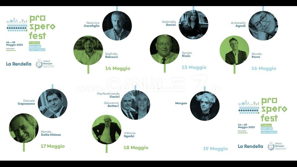 Dal 14 al 19 maggio 2023 torna a Monopoli il Prospero Fest, l’evento promosso dall’Assessorato alla Cultura. 10 incontri con gli autori e una conversazione al Porto Vecchio. Sono i numeri di una rassegna che anno dopo anno sta conquistando un pubblico sempre più numeroso.