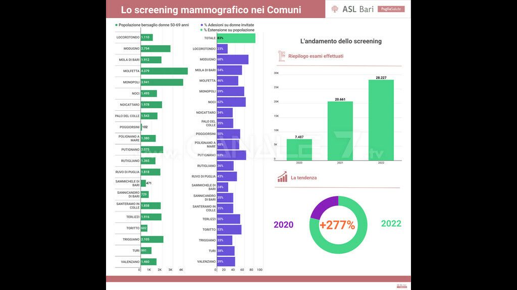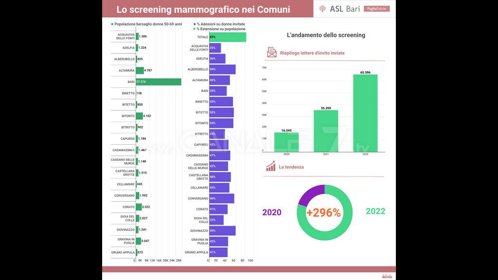Oltre 65mila lettere d’invito distribuite e più di 28mila mammografie eseguite su donne dai 50 ai 69 anni, con un incremento complessivo di quasi il 300%. Sono i numeri salienti del 2022, anno in cui il programma di Screening mammografico della ASL Bari ha ripreso a pieno regime, grazie ad una migliore organizzazione, al potenziamento delle risorse umane e ad una rete di 10 centri per l’esecuzione degli esami distribuiti strategicamente su tutto il territorio.