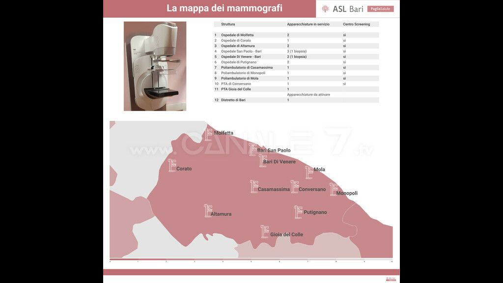 La ASL Bari ha messo a punto negli ultimi tre anni una rete di 10 Centri dedicati allo screening, distribuiti tra sei ospedali (Di Venere, San Paolo, Altamura, Corato, Molfetta, Putignano) e quattro poli territoriali (PTA di Conversano e poliambulatori di Mola, Casamassima e Monopoli), cui si aggiunge il PTA di Gioia del Colle per la senologia istituzionale (per donne fuori dalla fascia screening). In totale, sono attualmente in servizio 17 mammografi digitali, di cui 13 dotati di tecnologia 3D di ultima generazione acquistati e installati a partire dal 2020. Prossimamente, è prevista l’installazione di un nuovo mammografo 3D anche nel Distretto socio sanitario di Bari, rinforzando ulteriormente la dotazione del capoluogo per rispondere efficacemente alla domanda di prevenzione proveniente dalle oltre 27mila donne in fascia screening.