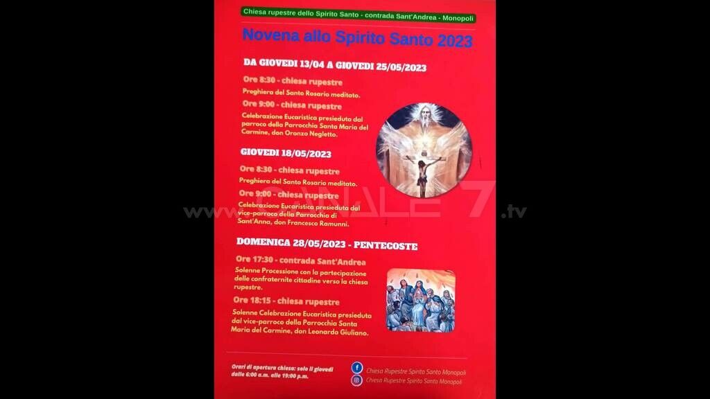 A partire da oggi giovedì 13 aprile e fino al 25 maggio prossimo a Monopoli presso la chiesa rupestre dello Spirito Santo, in contrada Sant’Andrea, appuntamenti mattutini alle ore 08:30 con il Santo Rosario Meditato e alle 9.00 la celebrazione eucaristica. Ad officiare la Messa don Oronzo Negletto, parroco della Madonna del Carmine. Giovedì 18 maggio, dopo il Rosario, a celebrare la Santa Messa, sarà Don Francesco Ramunni, parroco di Sant’Anna. Quella della Novena allo Spirito Santo è tra le manifestazioni più antiche del culto dei monopolitani. Si rinnova la Novena allo Spirito Santo, così ogni giovedì fino alla domenica di Domenica di Pentecoste, festa che celebra l'effusione dello Spirito Santo, dono di Gesù, che cade nel cinquantesimo giorno a partire dalla Pasqua. In esso si ricorda il compimento delle promesse di Gesù Cristo, con la discesa dello Spirito Santo sugli Apostoli.I fedeli si ritroveranno davanti al Cimitero Monumentale, poco distante dalla chiesetta dello Spirto Santo, per giungere in Processione e con la partecipazione della confraternita di S.Lucia, alla chiesetta rupestre, dove avverrà la solenne celebrazione eucaristica di Pentecoste all’aperto.
