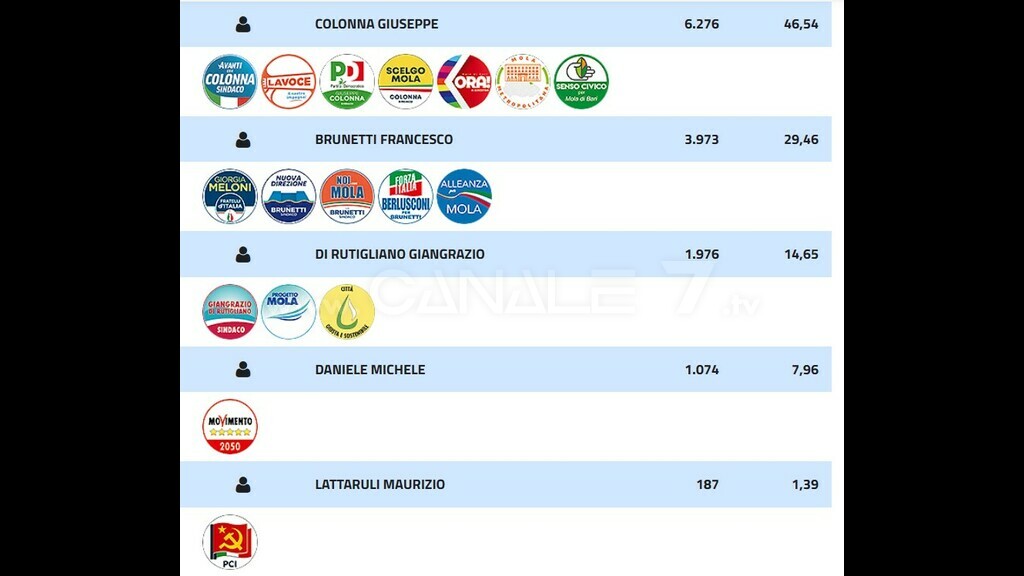 Che ballottaggio sia. Il 28 e 29 maggio, Giuseppe Colonna e Francesco Brunetti si giocheranno la poltrona di primo cittadino di Mola. Il sindaco uscente ha raccolto il 46,54% delle preferenze, mentre Francesco Brunetti si è fermato al 29,46%. Più staccati Giangrazio Di Rutigliano con il 14,65%, Michele Daniele con il 7,96%, Maurizio Lattaruli con l’1,39%. Colonna ha sperato sino all’ultimo non tanto di evitare il ballottaggio, quanto che la sua coalizione superasse il 50% delle preferenze, aspetto che avrebbe portato alla cosiddetta anatra zoppa in caso di vittoria di Brunetti al ballottaggio. Ma, alla fine, le liste di coalizione si sono fermate al 49,59%: per qualche decina di voti, dunque, la stessa coalizione non ha ottenuto la maggioranza assoluta in Consiglio comunale. Tra due settimane, dunque, sarà Colonna contro Brunetti