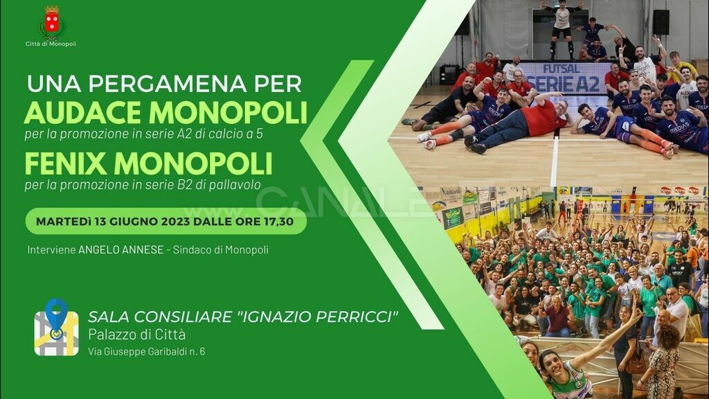 Martedì 13 giugno 2023 il Sindaco di Monopoli Angelo Annese incontrerà le squadre della Fenix Monopoli che recentemente hanno rispettivamente conquistato la promozione in Serie A2 di calcio a 5 e in Serie B2 di pallavolo. Ad entrambe le società sarà consegnata una pergamena (alle ore 17,30 all’Audace Monopoli e alle ore 18,15 alla Fenix).