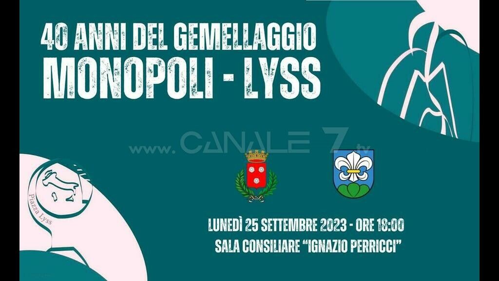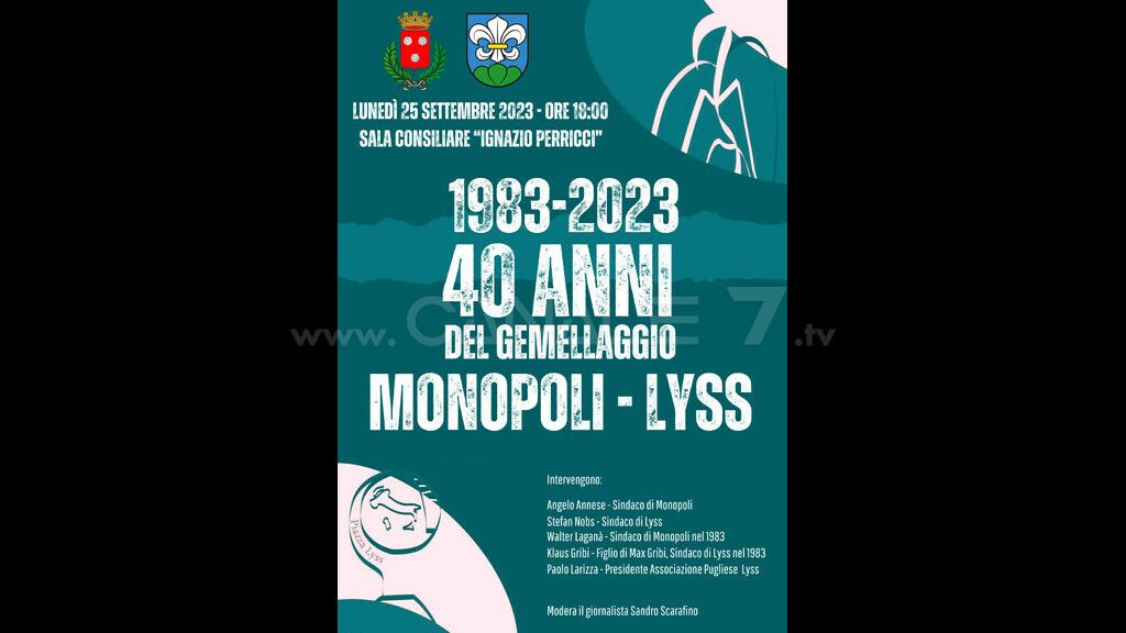 All’incontro saranno presenti il Sindaco di Monopoli Angelo Annese, il Sindaco di Lyss Stefan Nobs, il Sindaco di Monopoli del 1983 Walter Laganà, Klaus Gribi figlio del Sindaco di Lyss del 1983 Max Gribi, il Presidente dell’Associazione Pugliese Lyss Paolo Larizza e i sindaci del Comune di Monopoli degli ultimi 40 anni.