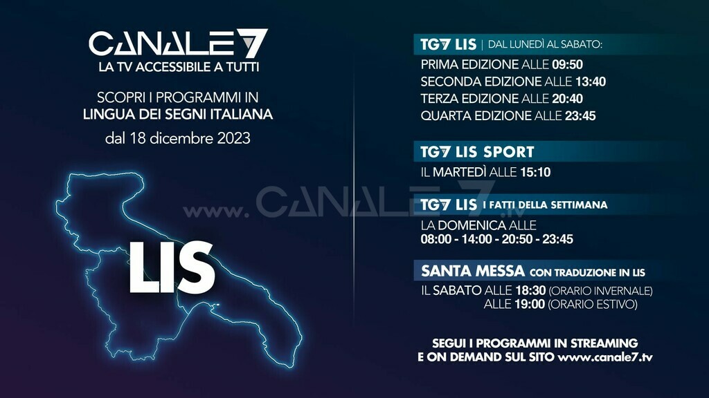 Tutti i programmi tradotti in LIS saranno accessibili contemporaneamente in Tv sul canale 78 del Digitale Terrestre e in streaming sul sito www.canale7.tv, un’opportunità anche per i sordi pugliesi che non risiedono in Puglia ma che potranno essere informati su quello che accade nella propria terra.