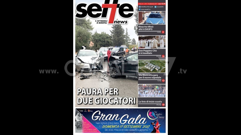 È in edicola Sette News, il settimanale di Monopoli. Centrale in copertina: Paura per due giocatori, le due auto si sono scontrate sulla strada provinciale Monopoli – Conversano; di lato, Rissa fra tifosi, altri 6 DASPO nuovi provvedimenti dopo i tafferugli a seguito della partita calcistica della squadra cittadina; Don Peppino Cito si è insediato una celebrazione eucaristica per dare il via al mandato del nuovo rettore della basilica con- cattedrale di Monopoli; Via libera alla gara per il nuovo ospedale prosegue l’iter per la realizzazione del nuovo grande nosocomio che sorgerà fra Monopoli e Fasano; Le foto di inizio scuola tutti i momenti più emozionanti delle feste dell’accoglienza organizzate dagli istituti comprensivi della città.Come di consueto all’interno troverete una ricca pagina di cronaca, approfondimenti sulla politica, l’attualità, la vita in città e naturalmente lo sport con tutte le novità sulle squadre cittadine. Quindi rubriche e appuntamenti. Questo e tanto altro su Sette News, il settimanale di Monopoli, in tutte le edicole.
