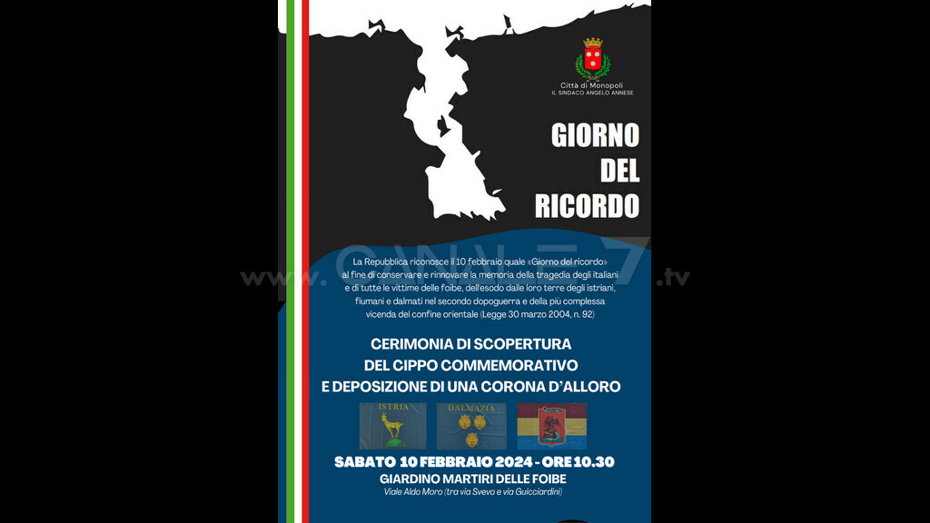 Sabato prossimo 10 febbraio 2024 alle ore 10,30 il Comune di Monopoli celebra il “Giorno del ricordo” solennità civile nazionale che ricorda i massacri delle foibe e l'esodo giuliano dalmata. Istituita con la legge 30 marzo 2004 n. 92, vuole "conservare e rinnovare la memoria della tragedia degli italiani e di tutte le vittime delle foibe, dell'esodo dalle loro terre degli istriani, fiumani e dalmati nel secondo dopoguerra e della più complessa vicenda del confine orientale"