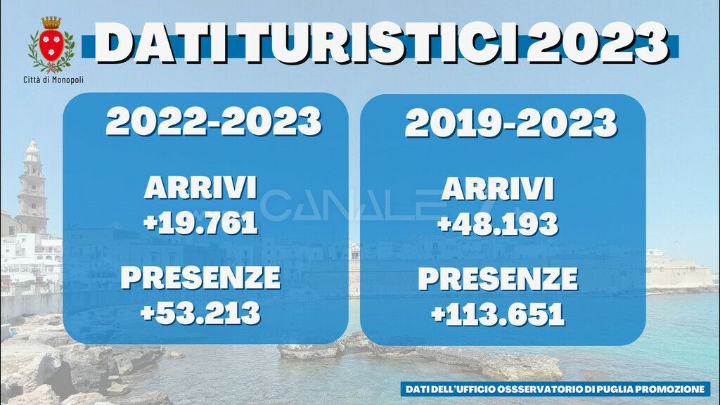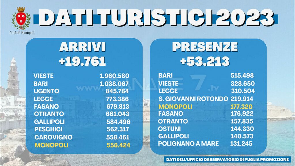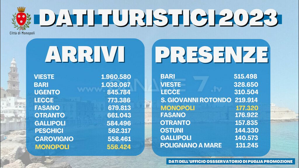 La Città di Monopoli nel confronto tra il 2022 e il 2023 registra un incremento di presenze di 19.761 e di arrivi di 53.213. La permanenza media è di 3,6 giorni. Monopoli sale di una posizione nella classifica delle presenze, stabilendosi al quinto posto dopo Bari, Vieste, Lecce e San Giovanni Rotondo; sul fronte degli arrivi Monopoli entra nella classifica delle prime dieci mete turistiche.