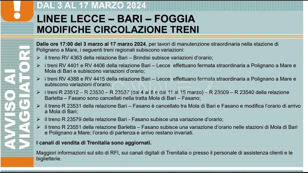 COMUNICATO - Modifiche alla circolazione di alcuni treni Regionali per lavori infrastrutturali programmati nella stazione di Polignano a Mare (BA) dal 3 al 17 marzo.