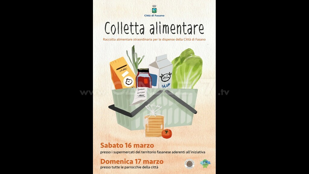 FASANO - L’amministrazione comunale e le parrocchie fasanesi chiamano a raccolta la comunità per la colletta alimentare. Sarà possibile donare generi alimentari sabato 16 marzo in tutti i supermercati del territorio fasanese aderenti all'iniziativa, e domenica 17 marzo in tutte le Parrocchie della Città.
