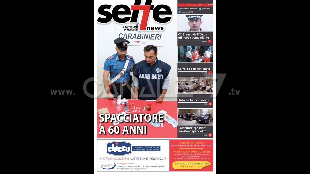 È in edicola Sette News, il settimanale di Monopoli. Centrale in copertina: Spacciatore a 60 anni, trovata centrale della droga in casa di un insospettabile pensionato monopolitano: di lato, CC: Emanuele D’Onofri è il nuovo Comandante, cambio della guardia per la stazione locale; Salvato uomo ustionato si tratta di un operaio di una stazione di servizio della città; Auto si ribalta in centro, la cronaca dello spettacolare incidente che fortunatamente non ha avuto alcuna conseguenza, anche per lo stesso conducente; Carabinieri “postini” arrestano spacciatori, in manette una intera famiglia della vicina Castellana Grotte. Come di consueto all’interno troverete una ricca pagina di cronaca, approfondimenti sulla politica, l’attualità, la vita in città e naturalmente lo sport con tutte le novità sulle squadre cittadine. Quindi rubriche e appuntamenti. Questo e tanto altro su Sette News, il settimanale di Monopoli, in tutte le edicole.