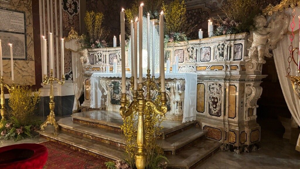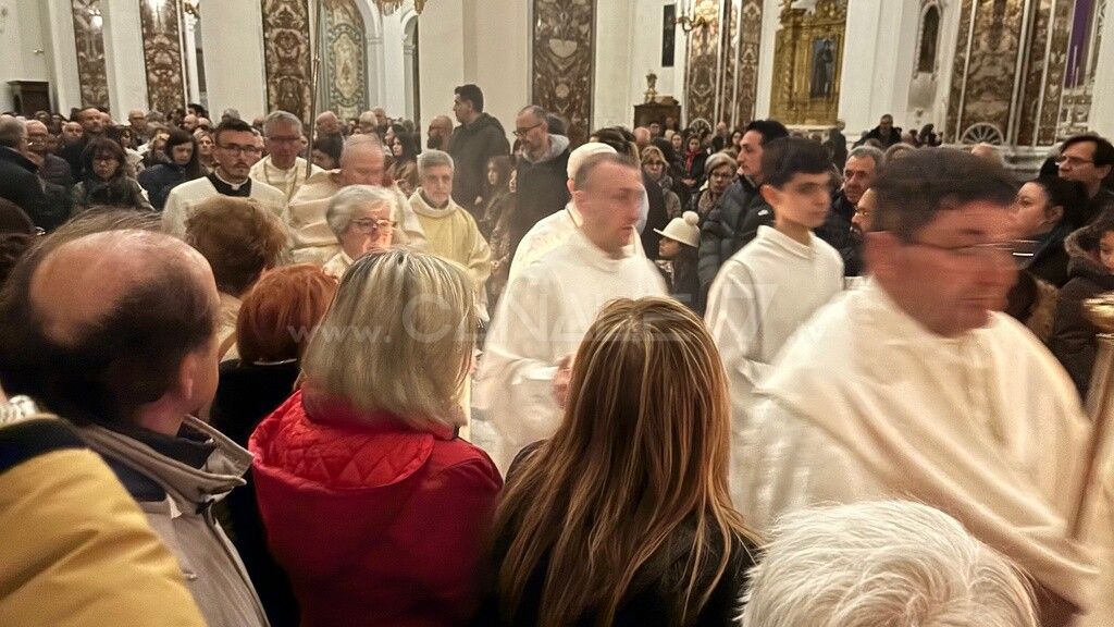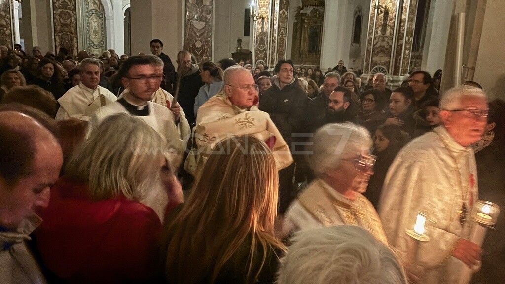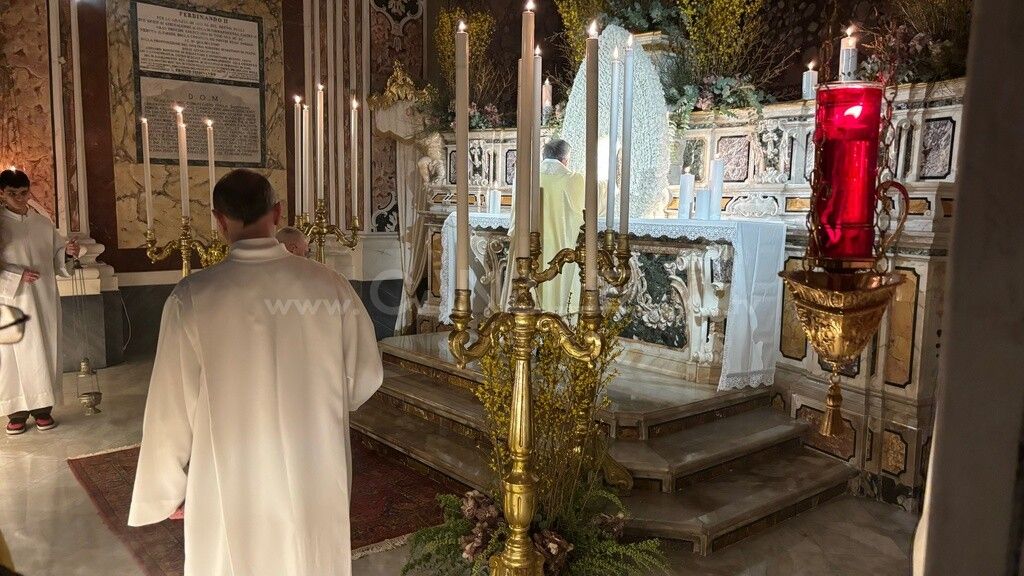 Al termine della messa in Coena Domini, vescovo, ministranti in corteo si sono recati all’altare del Santissimo Sacramento, dove è stata posta l’Eucaristia per l’adorazione dei fedeli, sull’Altare della Reposizione, chiamato erroneamente nel linguaggio popolare, sepolcro. Qui sono collocati il tavolo, simbolo del sacrificio; il pane; i 12 piatti degli Apostoli e il Tabernacolo dove è posta l’Eucaristia. Questo in cattedrale ieri sera e così in tutte le chiese e parrocchie cittadine aperte al culto. Tradizione popolare vuole che i fedeli in pellegrinaggio ne debbano visitare in numero dispari, almeno tre.