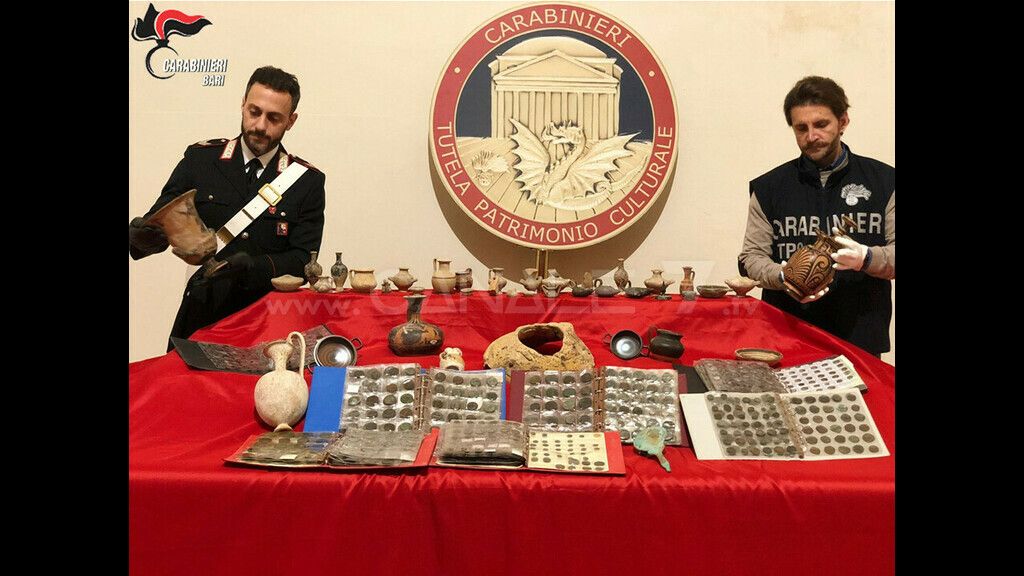 I Carabinieri della Stazione di Bari Carbonara, in collaborazione con militari del Nucleo Tutela Patrimonio Culturale e del NIPAAF di Bari, hanno deferito in stato di libertà due pensionati di 82 e 67enne, residenti a Bari e incensurati, sul cui conto emergono gravi indizi di colpevolezza (accertamenti compiuti nella fase delle indagini preliminari che necessitano della successiva verifica processuale nel contraddittorio con la difesa) in ordine ai reati di “ricettazione di beni culturali” e “violazioni in materia di alienazione di beni culturali” (art. 518 quater e novies c.p.).