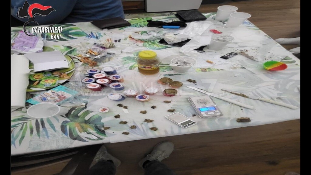 Nei giorni scorsi, i Carabinieri della Tenenza di Mola di Bari e del Nucleo Operativo e Radiomobile, hanno eseguito una perquisizione domiciliare all’interno di una stanza di un B&B del posto, presa in locazione per una notte da uno degli arrestati, dove sono stati sorpresi ed identificati i sette giovani intenti nel confezionamento delle dosi di droga. Al termine delle operazioni dei Carabinieri sono stati rinvenuti 750 grammi di hashish, di cui parte già suddivisi in “dosi” pronte per lo spaccio e 14 “panetti” occultati all’interno di contenitori in carta con il marchio delle lattine di bevande varie. È stato rinvenuto inoltre diverso materiale per il confezionamento, 2 bilancini elettronici di precisione e la somma contante di 475,00 euro.