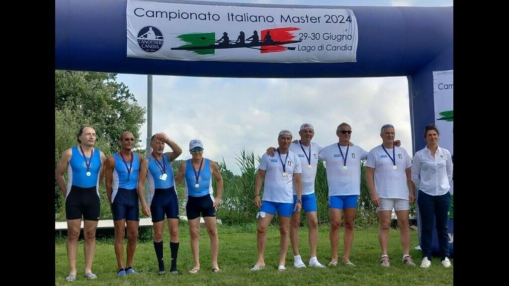 I tre atleti promonopolitani del suddetto equipaggio hanno fatto doppietta nella gara dell’OTTO Master Over 54 Mix conquistando l’oro e titolo italiano insieme a Massimo Amodio, Alessandra Lacatena, Marni Vizzi, Michela Daniele (Tiber Roma) e Barbara Paladini (Tiber Roma), con a timone Nora Gosso degli Amici del Fiume di Torino.