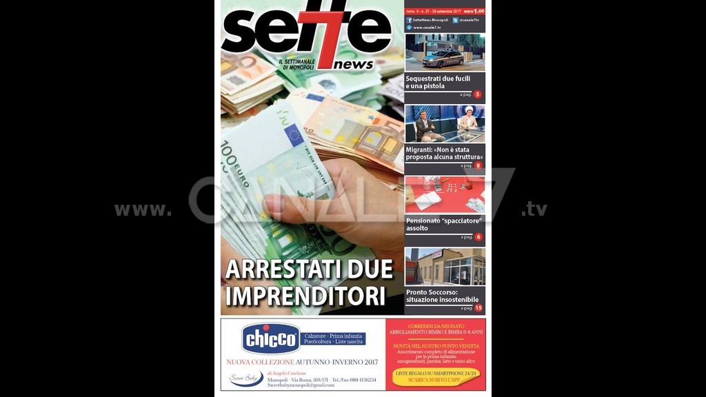 Centrale in copertina: Arrestati due imprenditori un’ operazione della GdF per bancarotta fraudolenta; di lato, Sequestrati due fucili e una pistola gli agenti hanno perlustrato il centro cittadino e numerose contrade dell’agro; Migranti: «Non è stata proposta alcuna struttura» lo ha detto il sindaco Emilio Romani nel corso del programma di approfondimento “Perché?”; Pensionato “spacciatore” assolto secondo il giudice il fatto non sussiste ma ci sono altri indagati; Pronto Soccorso: situazione insostenibile il direttore generale fa sapere che è in arrivo il potenziamento del personale.