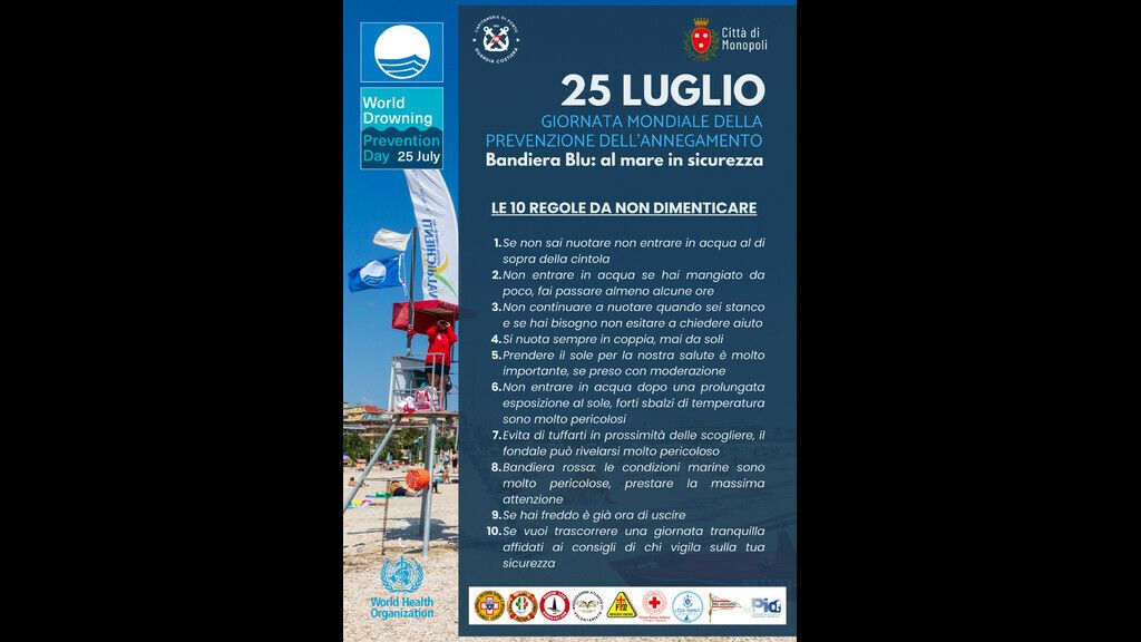 In occasione della Giornata Mondiale della Prevenzione dell'Annegamento (World Drowning Prevention Day) del 25 luglio 2024, il Comune di Monopoli (Bandiera Blu 2024) ha organizzato sulla spiaggia pubblica di Porto Rosso un evento di prevenzione e sensibilizzazione ai bagnanti.