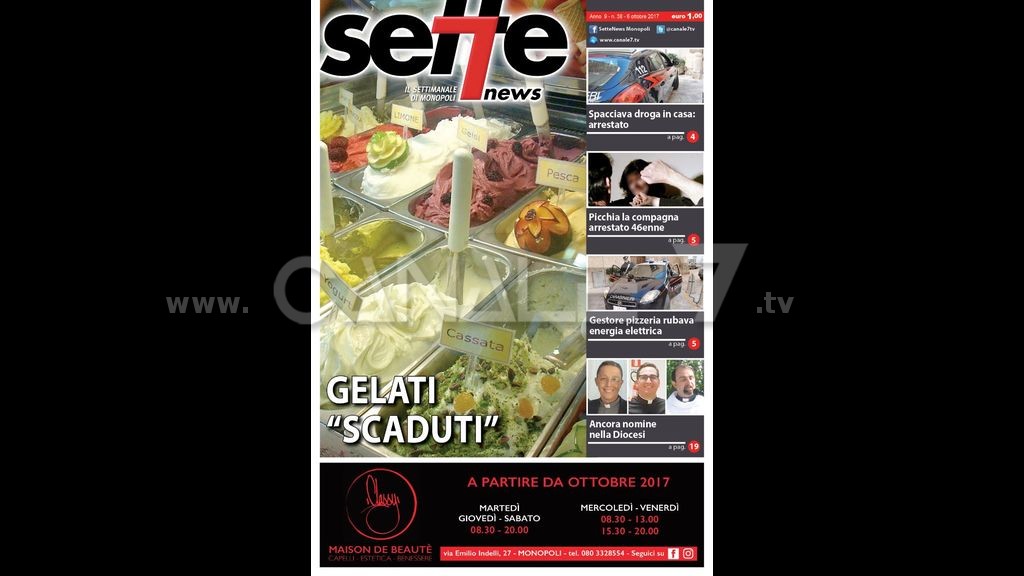 Centrale in copertina: Gelati “Scaduti” prodotti non idonei utilizzati per gelati e granite denunce anche in città; di lato, Spacciava droga in casa: arrestato, in manette un 37enne nel corso di un’operazione dei carabinieri della compagnia di Monopoli; Picchia la compagna: arrestato 46enne, i carabinieri sono intervenuti allertati da un vicino. Maltrattamenti in famiglia l’accusa a carico dell’uomo; Gestore Pizzeria rubava energia elettrica i Carabinieri sono intervenuti su segnalazione della società erogatrice; Ancora nomine nella diocesi, lo ha comunicato il vescovo mons. Giuseppe Favale nella lettera di inizio dell’anno pastorale.