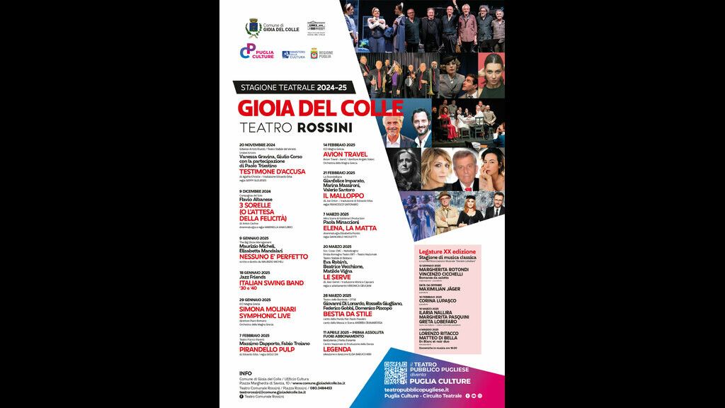 Anche quest’anno, agli undici imperdibili appuntamenti, che abbracciano il dramma, la commedia, il jazz, lo swing e il pop, si aggiungono la prima assoluta, fuori abbonamento, di “Legenda”, ideata e diretta da Elisa Barrucchieri, i cinque concerti di musica classica inseriti nella programmazione della XX edizione di “Legature” e gli spettacoli della rassegna “La scena dei ragazzi 2024-2025”, riproposta dal comune di Gioia del Colle nell’ambito delle politiche a sostegno dell’Infanzia.