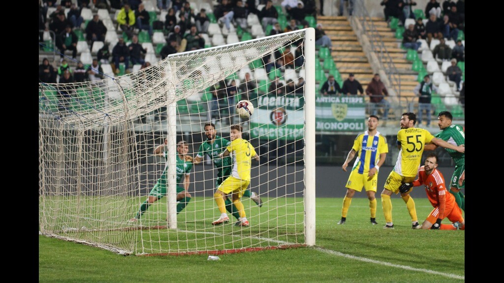 Ancora un pareggio interno per il Monopoli al termine di un match molto combattuto.La partita. Colombo recupera Battocchio e lo schiera dal primo minuto in cabina di regia. Dentro anche Falzerano come mezz’ala, mentre in avanti Yeboah viene preferito inizialmente a Grandolfo. Nel Cerignola dentro Jallow dal primo minuto al fianco di Salvemini, Bianchini sostituisce Capomaggio in cabina di regia, Gonnelli recuperato al centro della difesa. La Curva Nord festeggia i suoi 40 anni con una maxi-coreografia. La prima parte della prima frazione è decisamente di marca cerignolana, che, dopo un primo tiro di Valenti sul quale Yeboah non riesce a deviare, prende in mano la partita e comincia a fare gioco soprattutto grazie al lavoro dei centrocampisti, tutti di grande qualità. All’11’ il vantaggio ospite: Bianchini lascia partire una conclusione dai 25 metri che si spegna alle spalle di Vitale. Gli ofantini continuano a fare gioco e vanno più volte vicini al gol, ma negli ultimi dieci minuti esce finalmente il Monopoli. Al 40’ Scipioni prova a sorprendere il portiere con una punizione dai 22 metri, Saracco devìa in corner. L’occasione migliore capita a Yeboah al 45’: l’attaccante ghanese si presenta tutto solo davanti a Saracco, che è bravo a restare in piedi sino all’ultimo e a respingere con il piede sinistro. Si va al riposo con il Cerignola in vantaggio per 1-0 e con i nervi a fior di pelle all’uscita dal campo, con cinque-sei giocatori coinvolti. Alla fine, torna la calma e si può tornare negli spogliatoi. Ad inizio ripresa subito dentro Velazquez per l’infortunato Gonnelli. Al 5’ Jallow difende il pallone a destra, tiro cross che sfiora la traversa. Al 7’ occasione per i biancoverdi: Yeboah scatta sul filo del fuorigioco e serve Vazquez, tiro dal limite, Saracco si distende e respinge. Al 13’ Colombo cambia tutto: dentro Bruschi e Bulevardi si passa al 4-2-4. Poi, dopo pochi minuti dentro Grandolfo per Yeboah. E al primo pallone Grandolfo trova il pareggio: angolo di Bruschi, Saracco a vuoto, sul secondo palo l’inzuccata vincente del numero nove biancoverde e 1-1. Cerignola pericoloso in contropiede al 21’ con Salvemini che conclude, Vitale blocca in due tempi. Ultimi cambi per Colombo con gli ingressi di Virgilio e Ferrini. Si passa al 4-2-3-1 con Virgilio trequartista. Occasione per il Cerignola al 35’: girata di Salvemini che termina alta. Nel finale accade di tutto: Valenti non ce la fa più e resta in partita nonostante zoppichi. Proteste per un fallo di Saracco su Bruschi che l’arbitro non ritiene da ultimo uomo, mentre dall’altra parte un contropiede cinque contro tre porta Tascone vicinissimo al gol, ma la ciabattata termina a lato. Dopo cinque minuti l’arbitro manda tutti negli spogliatoi. Finisce 1-1