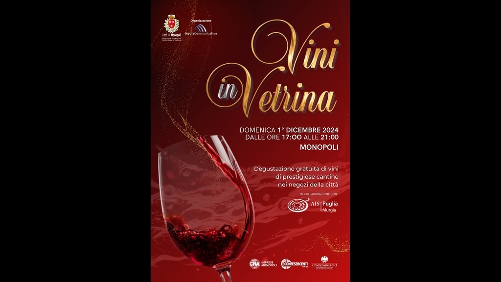 Domenica 1° Dicembre 2024 si svolgerà la sesta edizione di Vini in Vetrina, degustazione gratuita di prestigiose cantine nei negozi del centro di Monopoli organizzata da Media Communication, in collaborazione con L’AIS Associazione Italiana Sommelier Delegazione Murgia, il patrocinio del Comune di Monopoli e il coinvolgimento della CNA Imprese Monopoli, della Confesercenti Bari e della Confcommercio delegazione di Monopoli.