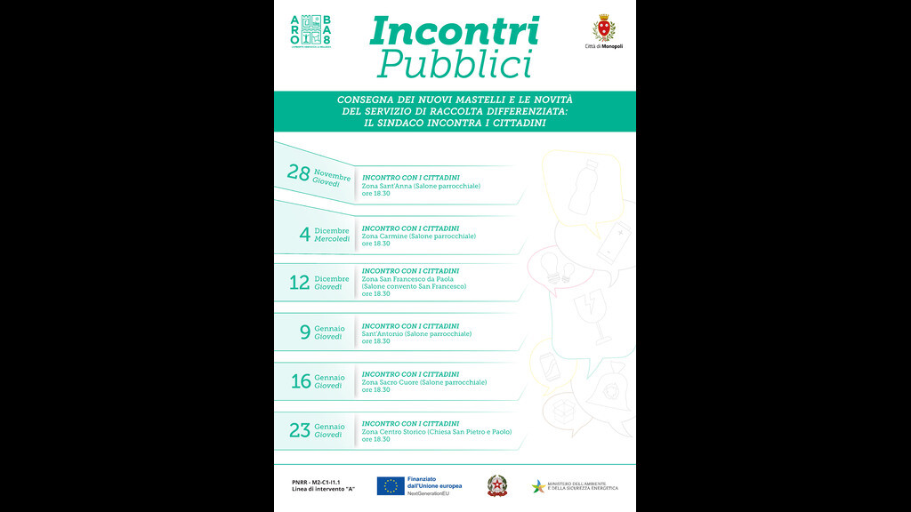 La distribuzione avverrà per zone, a partire dal quartiere Sant’Anna. I nuovi kit saranno consegnati porta a porta a ciascuna utenza insieme a dei simpatici gadget e, contestualmente, sarà lasciato un vademecum con consigli utili per una corretta raccolta differenziata. Saranno, inoltre, organizzati sei incontri pubblici con il Sindaco Angelo Annese a partire dal 28 novembre, per discutere delle novità del servizio di raccolta differenziata.