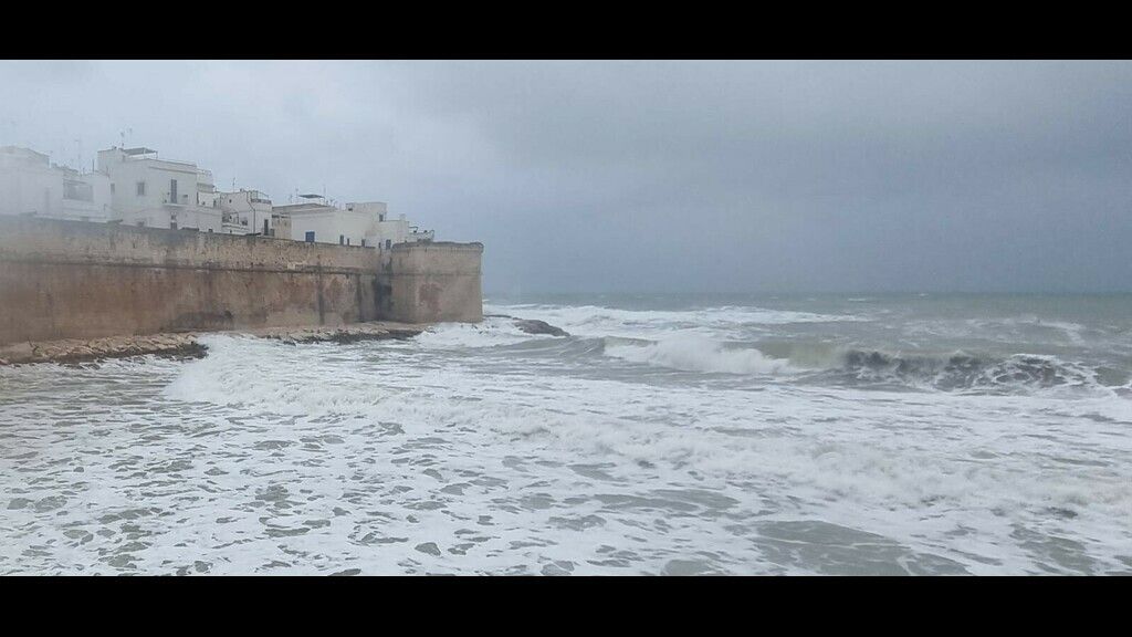 L’ondata di gran freddo sta sferzando la Puglia da nord a sud, come del resto l’intero Mezzogiorno. E in queste ore, oltre alla pioggia e al freddo pungente, si sono aggiunti forti venti di burrasca da Nord-Nord-Est, con raffiche di burrasca forte, e mareggiate lungo le coste esposte. Le immagini che vedete sono relative alla costa di Monopoli, stamattina lunedì 13 gennaio, intorno alle 9.00. Le temperature sono comprese tra un minimo di 4 gradi ed un massimo di 10 gradi. Tuttavia le temperature percepite sono decisamente più basse, tra lo zero e meno 4.
