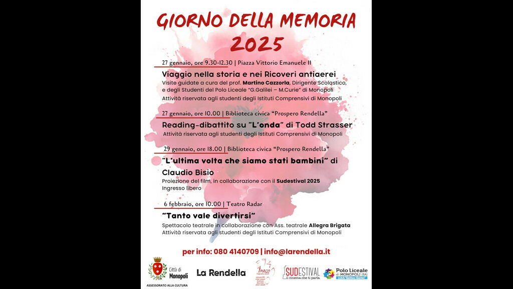 MONOPOLI - L'Assessore alla Cultura e alla Pubblica Istruzione, Rosanna Perricci in occasione del Giorno della Memoria, istituito nel 2005 dall’Assemblea generale delle Nazioni Unite come ricorrenza internazionale per commemorare le vittime dell’Olocausto e celebrata ogni anno il 27 gennaio, promuovono le seguenti iniziative in collaborazione con il Polo Liceale “G. Galilei – M. Curie, il Sudestival e l’Associazione Teatrale Allegra Brigata: