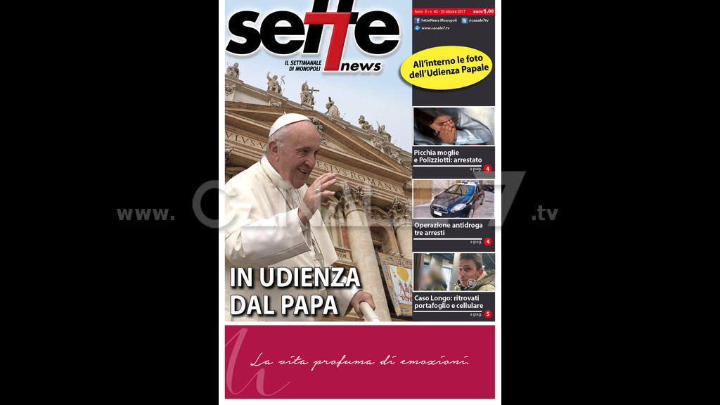 Centrale in copertina: In udienza dal Papa erano poco meno di 600 i fedeli della diocesi che hanno accompagnato l’icona di Maria SS. della Madia a Roma da Sua Santità; di lato, All’interno le foto dell’udienza papale il reportage fotografico del pellegrinaggio cui hanno partecipato il vescovo della diocesi mon. Favale e il primo cittadino Emilio Romani. Picchia moglie e poliziotti: arrestato l’uomo si era già reso protagonista di episodi simili in passato; Operazione antidroga: tre arresti un’operazione dei Carabinieri nel corso della quale sono finiti in manette una coppia ed un incensurato; Caso Longo: ritrovati portafoglio e cellulare i genitori del ragazzo scomparso dallo scorso marzo ne hanno parlato nel corso della trasmissione “Chi l’ha visto?”.