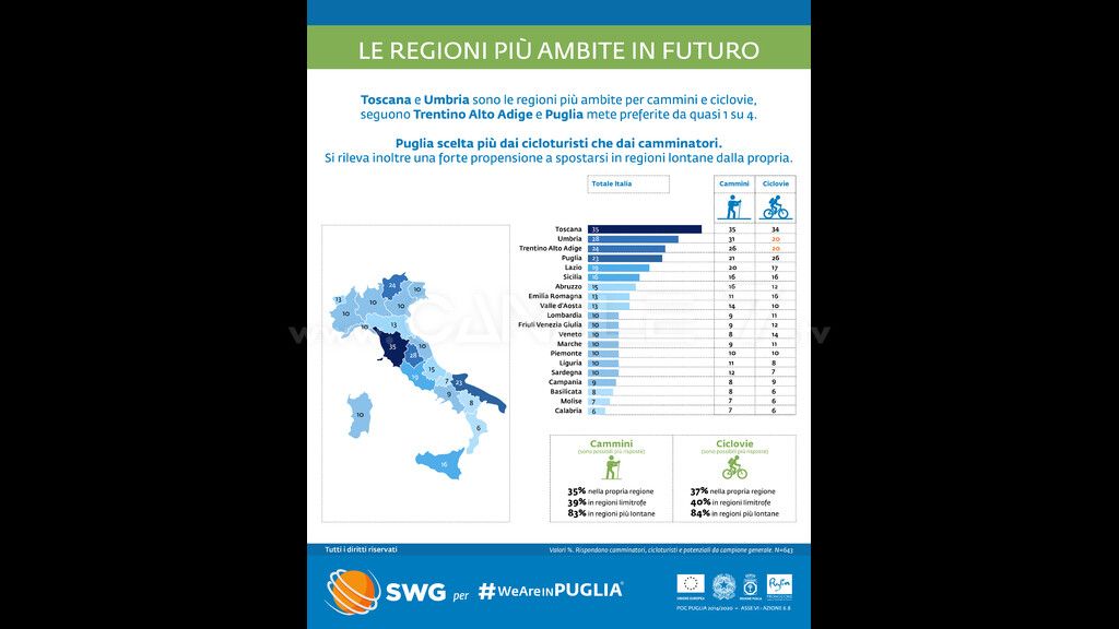 In prospettiva, gli intervistati da SWG hanno evidenziato come in prospettiva futura le regioni più ambite siano Toscana e Umbria per cammini e ciclovie, seguono Trentino - Alto Adige e Puglia mete preferite da quasi 1 su 4. La Puglia viene scelta più dai cicloturisti che dai camminatori. Si rileva, inoltre, una forte propensione a spostarsi in regioni lontane dalla propria.