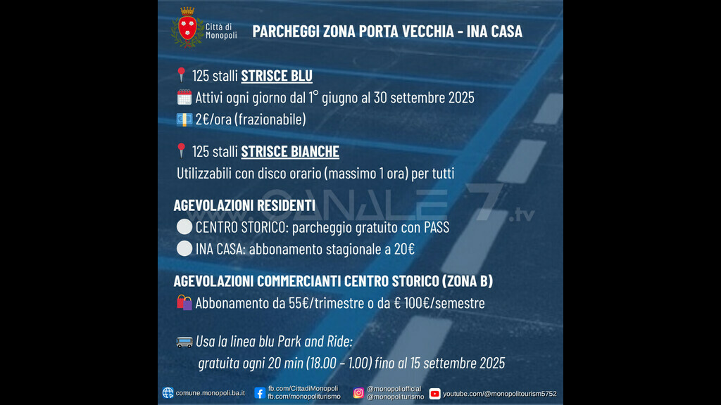 Aree a parcheggio nella zona compresa tra Porta Vecchia e Porto Bianco si cambia. Per l’estate 2025 viene superata la Ztl Ina Casa e viene introdotto un sistema di parcheggio a pagamento con strisce blu con agevolazioni per i residenti che consente un ricambio di posti auto più frequente. Il provvedimento, contenuto nella Delibera n. 148 del 18 giugno 2025, è stato presentato nel corso di una conferenza stampa alla presenza del Sindaco di Monopoli Angelo Annese e dell’Assessore alla Polizia Locale Antonella Fiume.