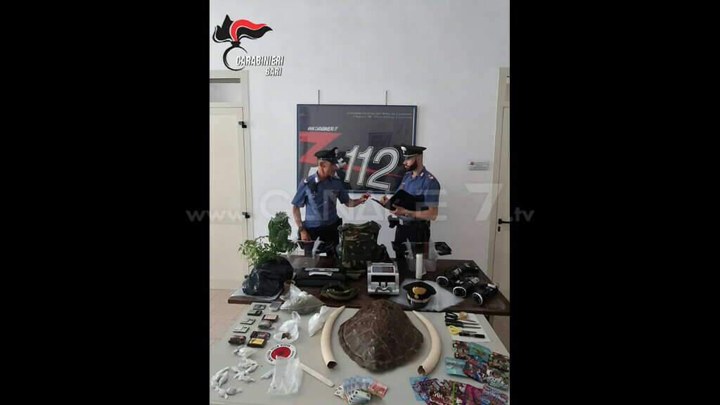 Gli operanti, nella tarda mattinata di giovedì 19 giugno, hanno eseguito dei controlli, avvalendosi anche dell’ausilio del Nucleo Carabinieri Cinofili di Modugno (BA), nel quartiere periferico di Bari dove vivono gli arrestati. All’esito della perquisizione domiciliare presso la loro abitazione ed anche in altro appartamento, dello stesso stabile, di proprietà dell’A.R.C.A. Puglia Centrale, occupato abusivamente dagli arrestati, i carabinieri hanno rinvenuto, complessivamente, 6 confezioni ed una busta in plastica per un peso complessivo di 260 grammi di marijuana, una busta in plastica contenente 50 grammi di hashish, cinque panetti per un peso totale di 450 grammi di hashish, tredici dosi di per un totale di 70 grammi di hashish, una busta in cellophane contente "cocaina in pietra" per un peso di 313 grammi, tre piante di marijuana, un giubbotto antiproiettile, denaro contante per un totale di 230 euro, cinque bilancini di precisione, una macchina per sottovuoto, un apparecchio contasoldi ed attrezzature per il taglio e confezionamento delle stesse. Sono stati rinvenuti, inoltre, un carapace di tartaruga “caretta caretta” e due zanne in avorio di elefante, di cui C.F. non era in grado di dimostrare la lecita provenienza e per tale motivo è stato denunciato anche per la violazione della specifica norma inerente il commercio internazionale delle specie animali e vegetali in via di estinzione.