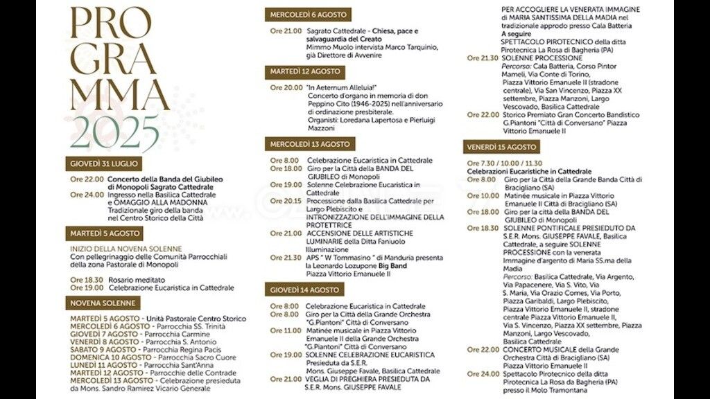 Alla mezzanotte di domani giovedì 31 luglio 2025 a Monopoli si avviano le iniziative per il mese Mariano, in onore della protettrice Maria Santissima della Madia. Il comitato Festa Patria ha già da tempo avviato i motori organizzativi.Iintervista a Flavio Petrosillo, presidente del locale Comitato Festa Patria. Un servizio nel telegiornale