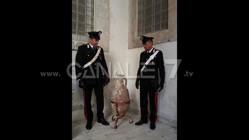 Durante l’operazione, condotta anche con un’unità del Nucleo Cinofili di Modugno, i Carabinieri hanno rinvenuto un’antica anfora verosimilmente di epoca romana, illecitamente detenuta dall’uomo in violazione della normativa in materia di Beni Culturali. L’anfora, alta circa un metro, in ottimo stato di conservazione, per il momento rimane custodita nella caserma della Compagnia CC di Monopoli, in attesa di essere consegnata alla Soprintendenza Archeologia delle Belle Arti e Paesaggio di Bari, dove sarà sottoposta a perizia.