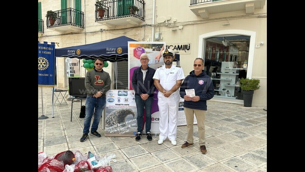 Si è svilta ieri domennica 5 ottobre 2025 a Fasano in piazza Ignazio Ciaia, l’iniziativa “Progetto Costa”, sulla sostenibilità ambientale, che gode del patrocinio e del sostegno di numerose realtà locali che hanno a cuore l’ambiente e il futuro del territorio, tra cui: il locale Rotary Club , Gruppo Ricerca Ecologica Fasano Fasano 2.0 (Torre Canne, Torre San Leonardo), la Capitaneria di Porto – Guardia Costiera, e l’associazione Dune Costiere. Un servizio nel telegiornale