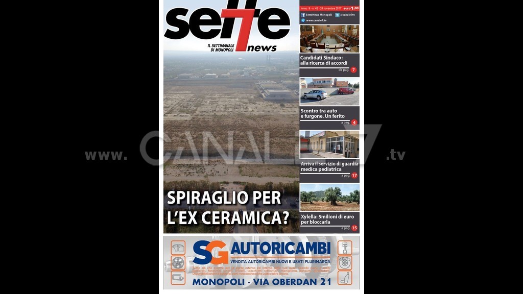 Centrale in copertina: Spiraglio per l’ex ceramica? si sarebbero fatti avanti nuovi acquirenti; di lato, Candidati sindaco: alla ricerca di accordi continuano fervide le trattative e le riunioni fra partiti in città; Scontro tra auto e furgone. Un ferito è avvenuto in via Conchia nella tarda mattinata; Arriva il servizio di guardia medica pediatrica sarà attivato in tutti i comuni del barese con oltre 50 mila abitanti; Xylella: 5 milioni di euro per bloccarla nuove direttive della comunità europea.
