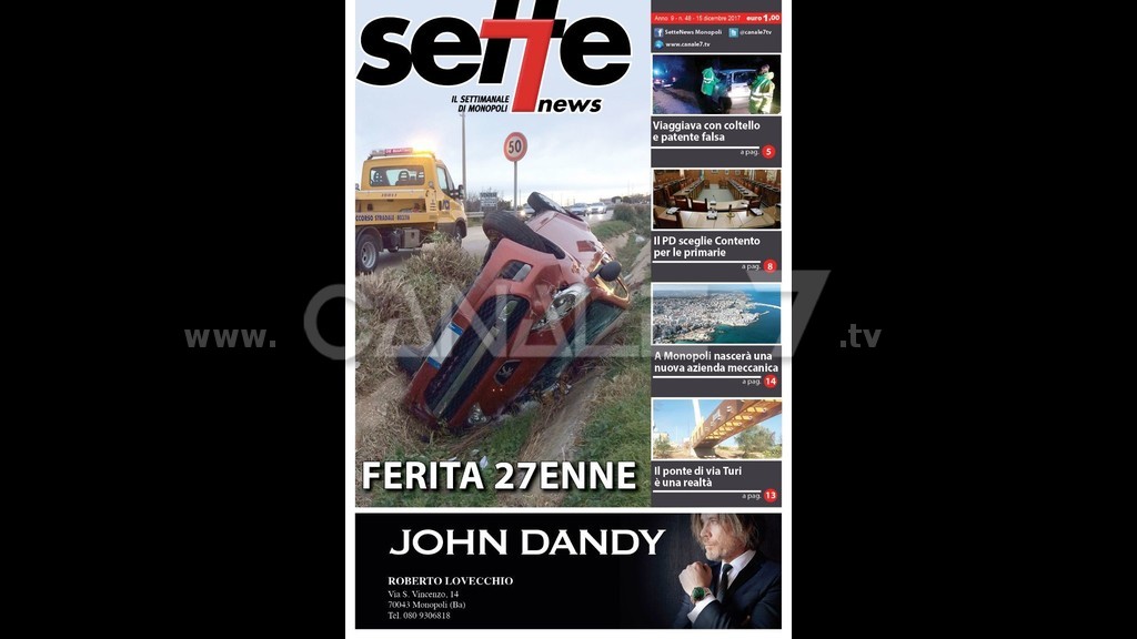 In copertina: Ferita 27enne la cronaca dell’incidente sulla complanare Monopoli- Polignano dove una giovane ragazza è finita in un fossato mentre era a bordo della sua auto; di lato, Viaggiava con coltello e patente falsa è stato fermato un 41enne che si è scoperto essere irregolare ed è stato denunciato dalla Polizia Locale; Il Pd sceglie Contento per le primarie lo ha ufficializzato il segretario cittadino del partito democratico; A Monopoli nascerà una nuova azienda meccanica si tratta dell’azienda milanese Tesmec ha deciso di investire nella nostra città milioni di euro; Il ponte di via Turi è una realtà è stato finalmente installato il ponte ciclopedonale che collegherà il quartiere con il complesso residenziale di Melvin Jones.