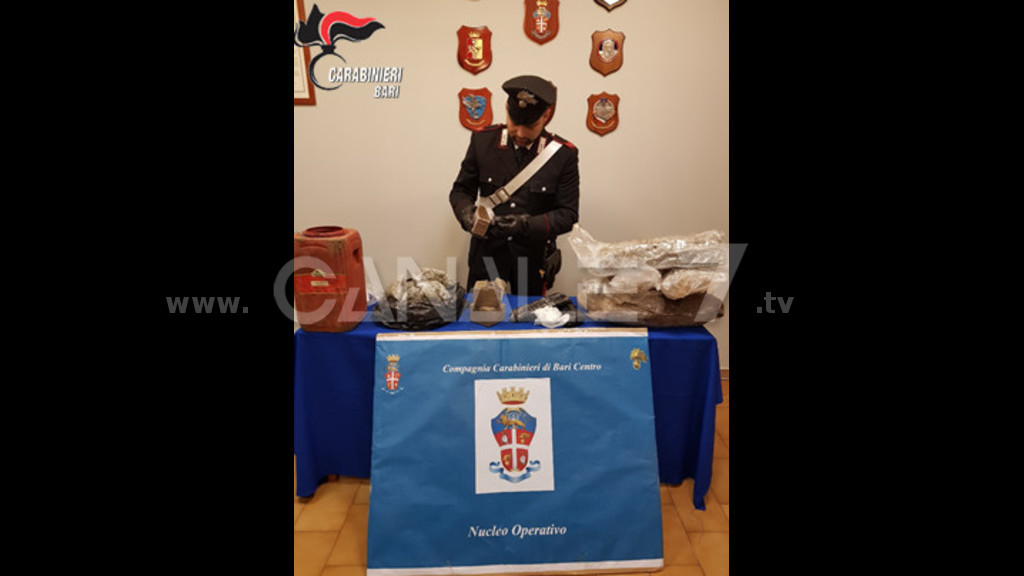 Nelle medesime circostanze di tempo, altre pattuglie del Nucleo Operativo, supportate da militari della Stazione di Bari Japigia, rinvenivano e ponevano sotto sequestro penale, nelle campagne retrostanti le palazzine di Via Caldarola, ben 1.1 kg di cocaina purissima, 2 kg di hashish e 6.4 kg di marijuana. Quest’ultimo considerevole quantitativo di sostanza stupefacente, per un valore di mercato al dettaglio stimato in quasi 200.000 euro, era riposto in alcuni bidoni sotterrati in diversi punti in aperta campagna. Tutta la sostanza stupefacente rinvenuta è stata trasmessa al L.A.S.S. (Laboratorio Analisi Sostanze Stupefacenti) del Comando provinciale Carabinieri di Bari per effettuare un esame specialistico al fine di stabilirne il principio qualitativo e quantitativo.