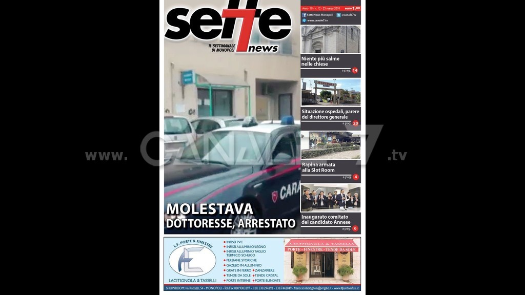 In copertina, Molestava dottoresse, arrestato si tratta di un 49enne che è stato fermato dai Carabinieri della locale Compagnia e dovrà rispondere di violenza sessuale; di lato, Niente più salme nelle chiese i nuovi luoghi individuati devono rispettare i requisiti previsti dalla legge regionale; Situazione ospedali, parere del direttore generale ospite del programma di approfondimento Perché il direttore Vito Montanaro; Rapina armata alla Slot Room, è accaduto giovedì sera intorno alle 22 nei locali della nota sala giochi; Inaugurato comitato del candidato Annese l’attuale assessore ai Lavori Pubblici ha dato il via alla campagna elettorale per le prossime amministrative di primavera.