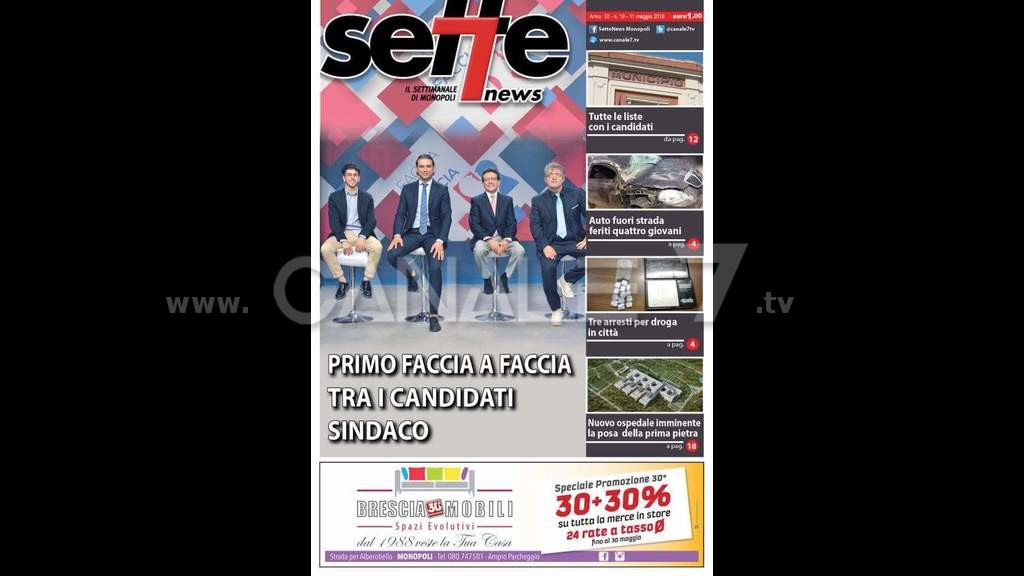 È in edicola SetteNews il settimanale di Monopoli. In copertina, Primo faccia a faccia tra i candidati sindaco si tratta del primo confronto televisivo dopo un incontro pubblico; di lato, Tutte le liste con i candidati i nomi della campagna elettorale che concorrono ad uno scranno in consiglio comunale; Auto fuori strada feriti quattro giovani un colpo di sonno la probabile causa dell’incidente avvenuto all’alba di domenica scorsa; Tre arresti per droga in città non si arrestano i controlli delle forze dell’ordine; Nuovo ospedale imminente la posa della prima pietra l’annuncio dal consigliere regionale Fabiano Amati. All’interno, come sempre, troverete una ricca pagina di cronaca, attualità, approfondimenti sulla politica, la vita in città e naturalmente lo sport con tutte le novità sulle squadre cittadine. Quindi rubriche e appuntamenti. Questo e tanto altro su Sette News, il settimanale di Monopoli, in tutte le edicole.