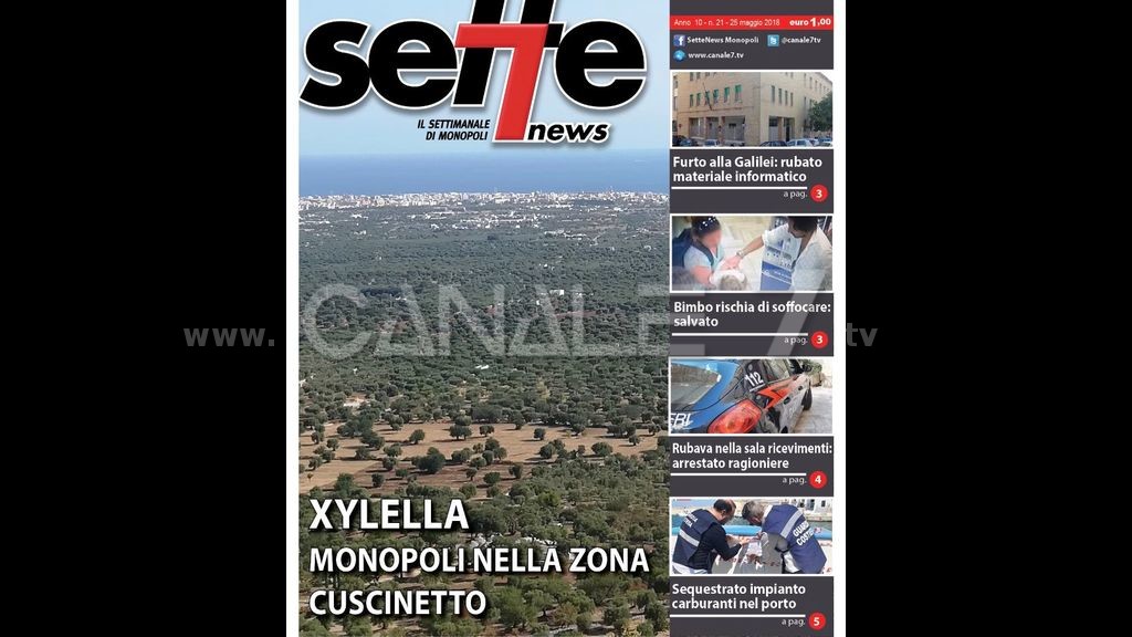 In copertina, Xylella Monopoli nella zona cuscinetto l’UE ha esteso l’area di quarantena; di lato, Furto alla Galilei: rubato materiale informatico hanno agito indisturbati nella notte tra giovedì e venerdì; Bimbo rischia di soffocare: salvato grazie alla manovra di disostruzione eseguita da un avvocato; Rubava nelle sale ricevimenti: arrestato ragioniere sottraeva qualche migliaio di euro al termine di ogni cerimonia; Sequestrato impianto carburanti nel porto una operazione della guardia costiera di Bari.