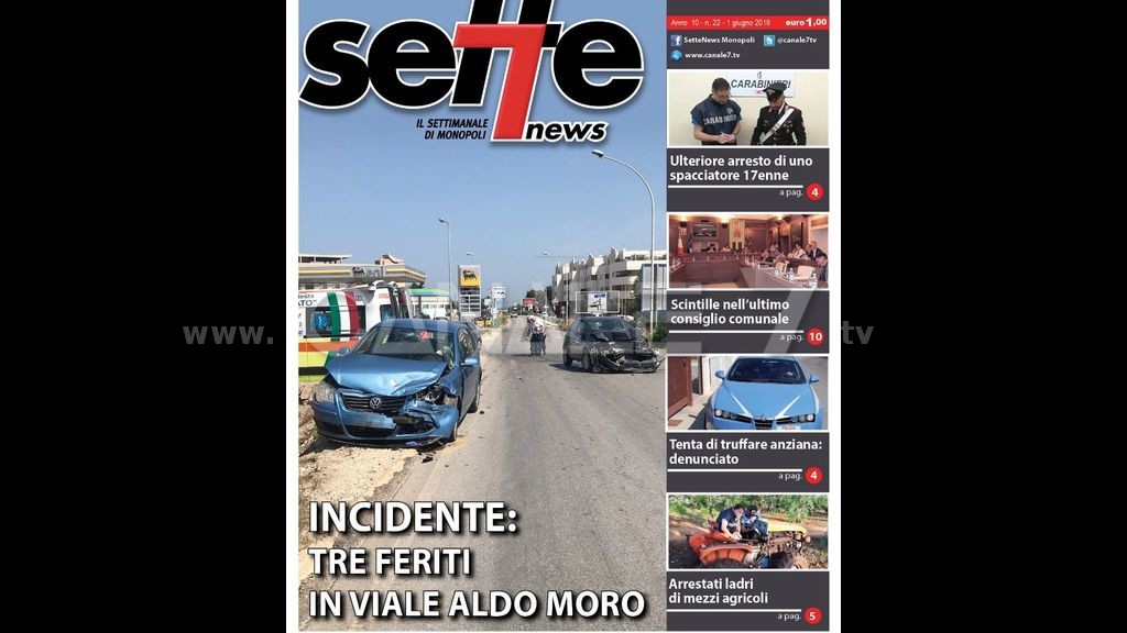 In copertina, Incidente: tre feriti in Viale Aldo Moro tragedia sfiorata in piena mattinata, sul posto sono intervenuti gli agenti del Comando di Polizia Locale; di spalla, Ulteriore arresto di uno spacciatore 17enne è stato colto il flagranza di reato dai Carabinieridel locale comando; Scintille nell’ultimo consiglio comunale non sono mancate le polemiche nel corso dell’ultima riunione della massima assise cittadina; Tenta di truffare anziana: denunciato l’uomo originario di Napoli ha cercato di raggirare la signora; Arrestati ladri di mezzi agricoli un ampia operazione effettuata dai Carabinieri.
