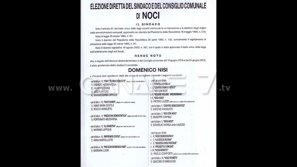 A Noci ufficialmente proclamati ieri 11 luglio 2018, con la rielezione del sindaco Domenico Nisi, gli eletti consiglieri comunali. Il verbale è stato diramato dallo stesso sindaco Nisi. In Consiglio Comunale oltre al Sindaco, Domenico Nisi, siederanno 16 consiglieri: 10 di maggioranza della coalizione di centrosinistra Noci Nisi 2018, 4 della coalizione di centrodestra, Insieme Noci, fra cui il candidato sindaco non eletto Piero Liuzzi e 2 della coalizione Noci Officina Civica, fra cui il candidato sindaco non eletto Paolo Conforti. La massima assise cittadina di Noci è formata da 12 uomini e 4 donne. In dettaglio vediamo gli eletti: PD - Notarnicola Fabrizio, Curci Giuseppe, Plantone Vito, Lippolis Mariarosaria; Nocisiamo - Gentile Anna Maria, Rocco Mansueto; Iniziativa Democratica per Noci - Mezzapesa Fortunato; Impronta Civica - Martellotta Anna; La Sinistra - Lippolis Mariano; Noi con Domenico Nisi - Lucia Barbara; Noi con Noci - D'Aprile Giuseppe; Centro Democratico - Mansueto Antonio; Idea Noci - Morea Stanislao; Noci Riparte - D'Ambruoso Giacomo. Infine i candidati sindaco eletti consiglieri, Piero Liuzzi e Paolo Conforti. Ufficializzato il consiglio comunale ora si attende la data della prima seduta della massima assise cittadine, ma anche il varo della nuova giunta a sostegno del riconfermato primo cittadino nocese. Per quanto riguarda la squadra di assessori, Nisi, il giorno del suo insediamento una settimana fa, affermò che era a lavoro per la costituzione del governo. Sarebbe stata la sintesi di un tavolo tecnico- politico, frutto degli accordi preelettorali tra le forze che l’hanno sostenuto nell’accesa campagna elettorale appena trascorsa.